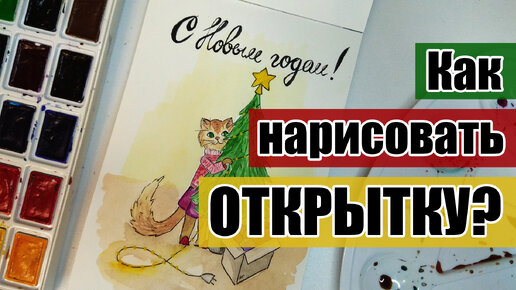 Как нарисовать новогоднюю открытку? | Легкая и красивая открытка с кошкой на Новый год своими руками