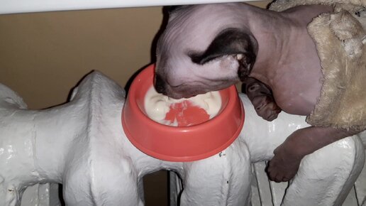 Кто в доме хозяин: котенок сфинкс ест сметану на батарее