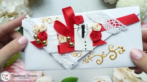Конверт для денег ручной работы "Молодожены" (красный с золотом)