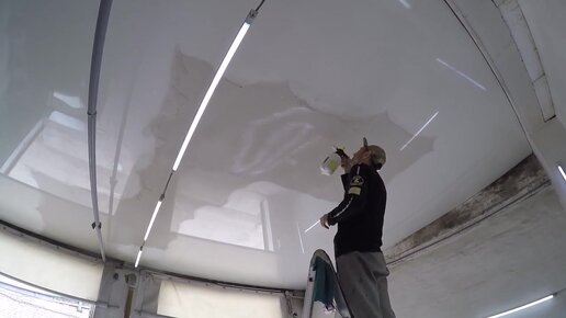 Мойка натяжного потолка с небольшим количеством воды, чтобы не забрызгать пол.