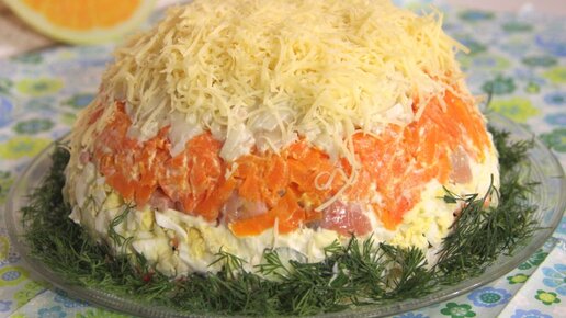 Необычный салат с кальмаром, крабовыми палочками и рыбкой.