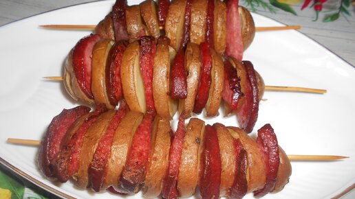 Картофель с колбасой запекаю на шпажках в обычной духовке