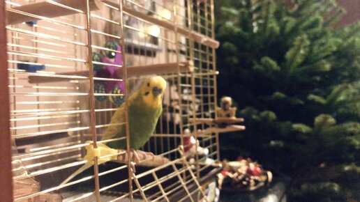 Попугайчик весело подпевает новогодней песенке.