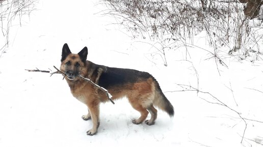 Собака Кира убегает с палками