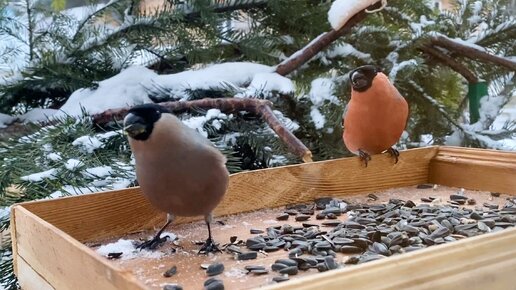 Снегирь с подружкой - как они щелкают семечки, просто машины по переработке семян