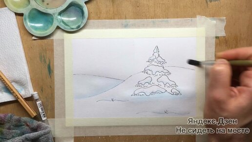 Пробую акварель по-мокрому. Ёлочка в снегу. Таймлапс