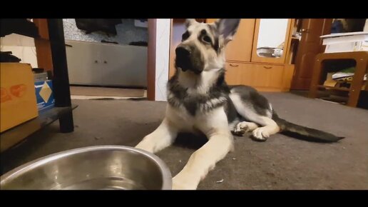 Кормление щенка. Его плошка, его корм. И он сам - голодный красавчик!