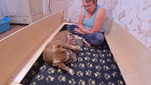 Собака первый раз видит своих щенков и пока не проявляет интерес к ним. Знакомим собаку с её щенками.