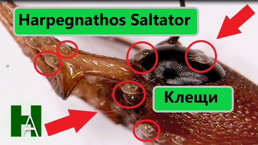 Муравей Harpegnathos Saltator под микроскопом усыпанный клещами