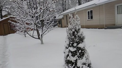 Снег! Падает на всех! И на ёлки на даче, и на дорожки...
