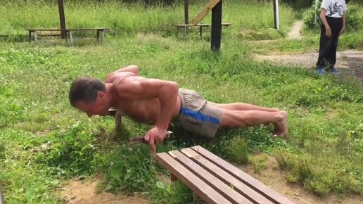 Дедушке 75 лет. Делает упражнения на свежем воздухе с собственным весом