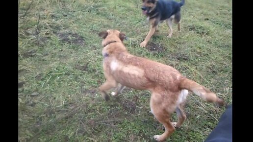 Рыжулю вывели гулять на поле. Первая встреча друзей