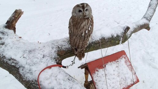 Домашняя Сова гуляет в парке и сидит у ребенка на голове.