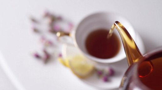 вид сверху на чайник наливает чай в среднюю чашку фарфора.