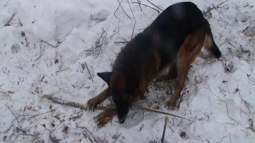 "Эрих, порычи!" Овчарка рычит и лает на палку.