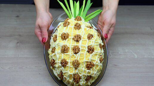 Готовлю салат "Ананас". Все ингредиенты укладываю слоями и подаю к столу.