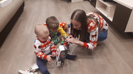 Годовасик распаковывает подарок от Деда Мороза. Показываю, что внутри