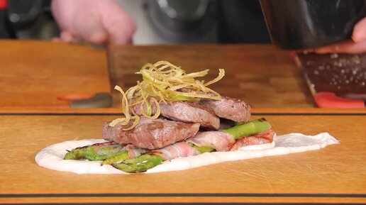 Медальоны из говядины с грилованной спаржей в беконе и с соусом тоннато