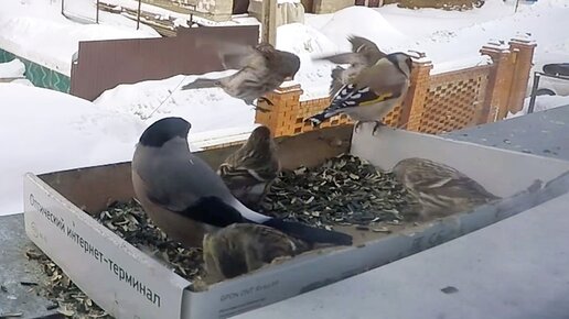 Сибирь, под Красноярском... Страсти у кормушки. Голоса птиц завораживают.