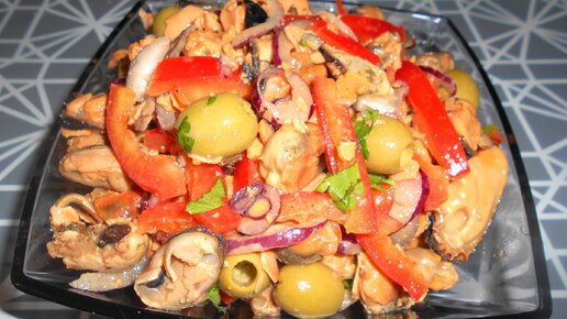 Салат из мидий с болгарским перцем и оливками гости съедают первым