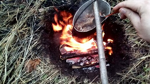 Готовим еду на костре в старом армейском котелке. Греча с мясом и тушенкой.