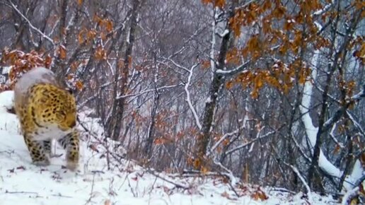 Амурский леопард в зимнем лесу