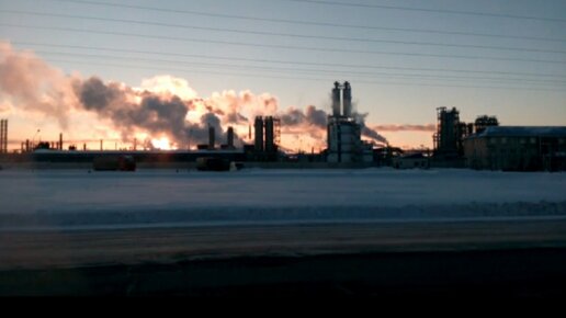 Едем отдыхать в местную зону отдыха зимой. Газовые факелы освещают нам дорогу