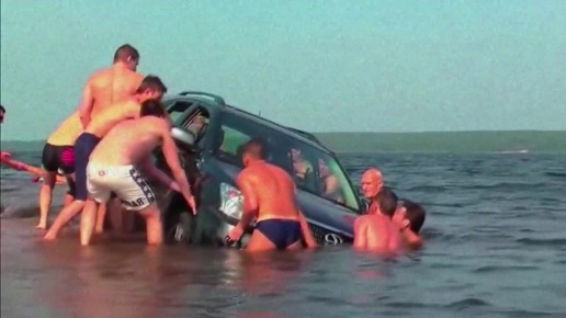 Мужики утопили Lexus и толпой пытаются вытащить его обратно