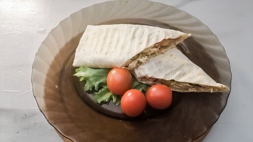 ПП шаурма с курицей, огурцами, помидором, маслинами, творожным сыром.
