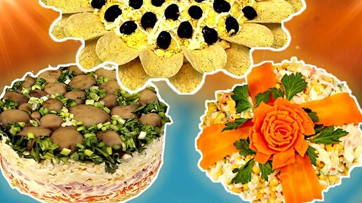 Салаты на праздничный стол! Салат с кальмарами! Салат Подсолнух! Салат Грибная поляна!