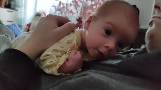 Полтора месяца сыну, его эмоции лёжа на отце