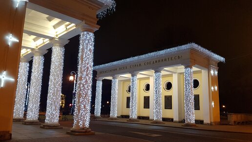 Смольный, аллея Смольного, Пропилеи и новогодняя елка на площади Пролетарской Диктатуры в Санкт-Петербурге