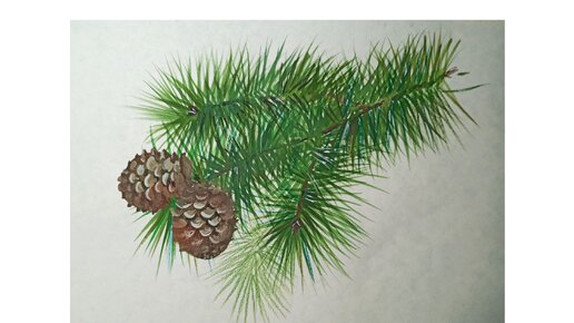 Сосновая ветка с шишками - рисунок гуашью.