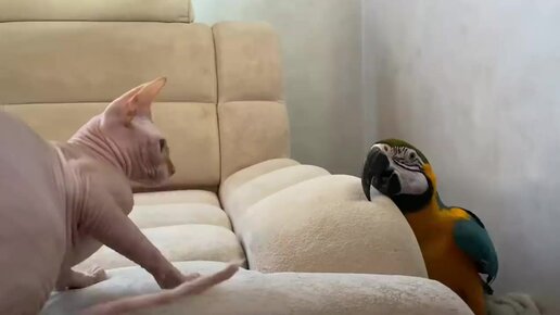 Кот сфинкс и Говорящий попугай Ара играют в прятки. Кот сфинкс не боится грозный