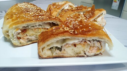 Рыбный пирог с семгой и беконом.Сытный праздничный рецепт пирога.