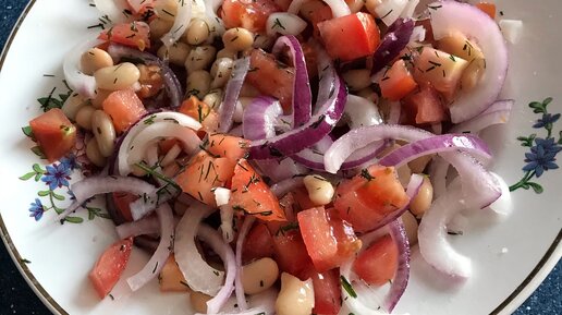 Быстрый и легкий салат из помидоров с красным луком и фасолью.