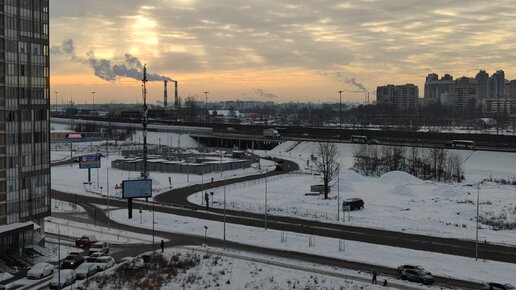Солнечное, но немного хмурое утро. Урбанистический вид на питерский КАД из Западного Мурино