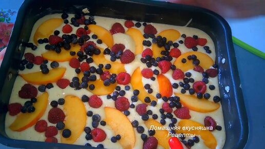 Самый простой бисквитный пирог с персиками, малиной и черникой.Рецепт пирога с ягодами.