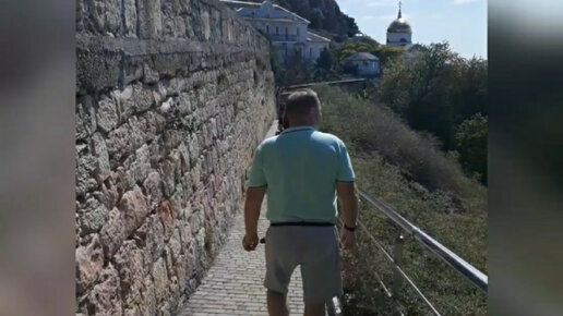 Спускаемся по лестнице в монастырь. Слева - стена, справа - море