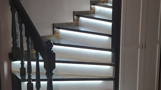 Монтаж деревянной лестницы на металлический каркас с подсветкой.
