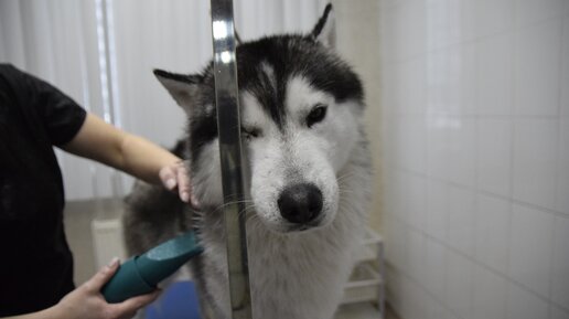 я тебя ненавижу- эти слова читаются в глазах хаски, которого 2,5 часа мыли, чесали, стригли когти и шерсть на лапках.