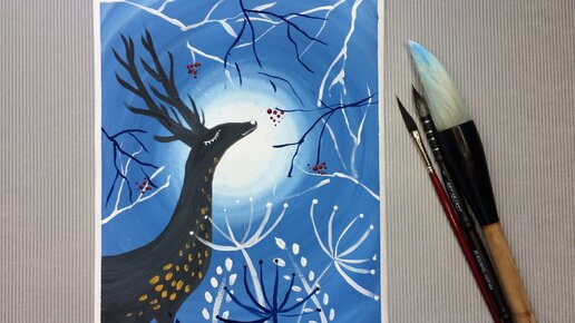 Рисуем оленя в зимнем лесу. Для детей от 6 лет. Гуашь
