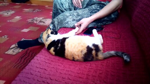 Старший сын играет с нашей старой кошкой. Сняла только конец.