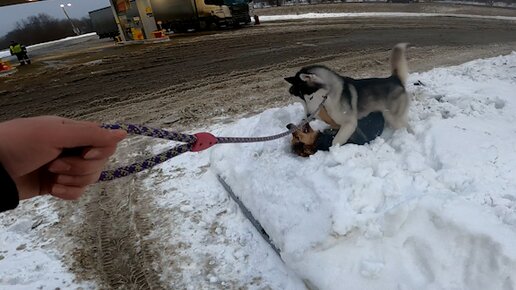 Хаски против Дровняжки, на Кобу во время прогулке напрыгнул кобель с заправки.
