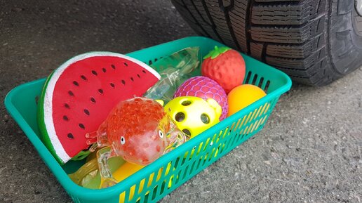 колесо машины давит всякие предметы.