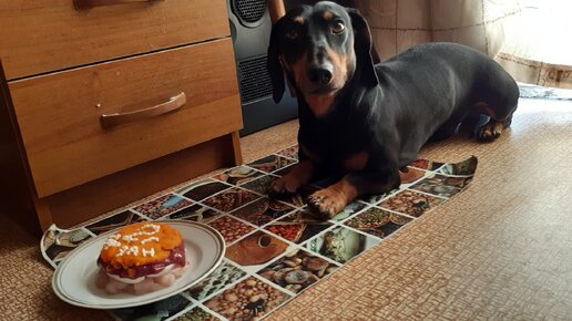 Такса ест торт в день рождения. Вкусно, аж уши завернулись:)