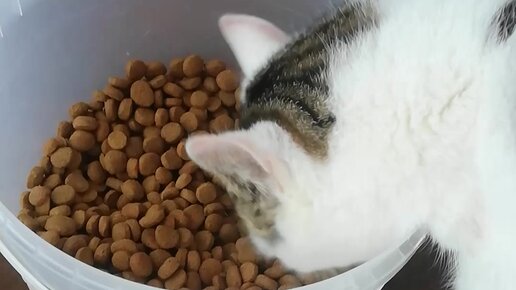 Ничего себе аппетит! Большое ведро с сухим кормом восхитило котят