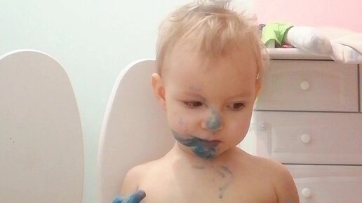 Ребёнок гримасничает на камеру и разрисовывает себя красками. Смешное видео.