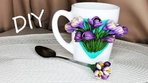 Декор кружки и ложки Букет Шафрана💐/Crocus polymer clay tutorial/Обзор Мастер класса. Подробный МК по ссылке в описании.👇 👇