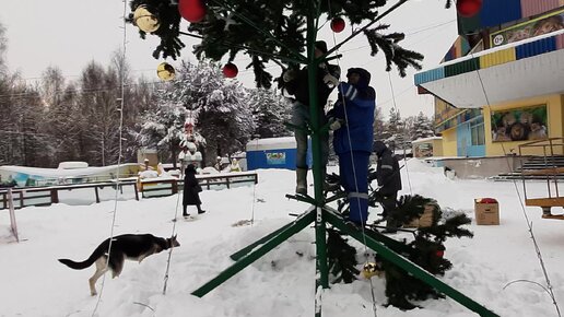 Разборная елочка. Рабочие убирают елку и ползают по ее стволу, будто мишки за лесным пчелиным медом